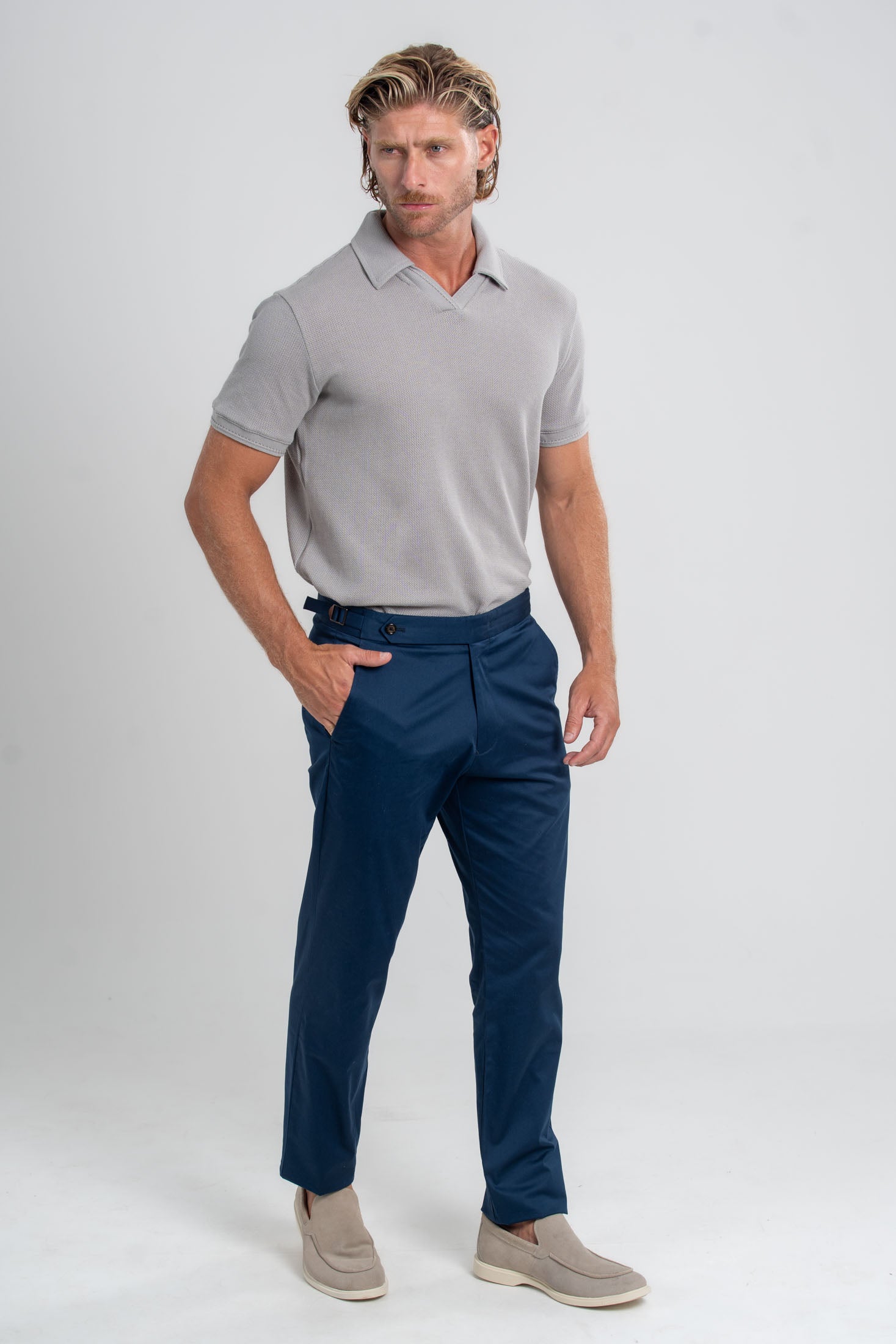 O tecido possui um leve brilho acetinado, sutil e elegante, que eleva o visual sem excessos. A modelagem slim garante um caimento alinhado e contemporâneo, enquanto o cós sem passadores de cinto, aliado aos reguladores laterais, reforça a estética clean e sofisticada da alfaiataria moderna.