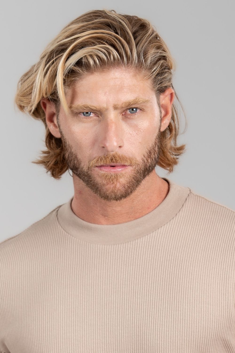 Modelo loiro veste tamanho M, com 1,80m e 80kg — a peça oferece caimento impecável.