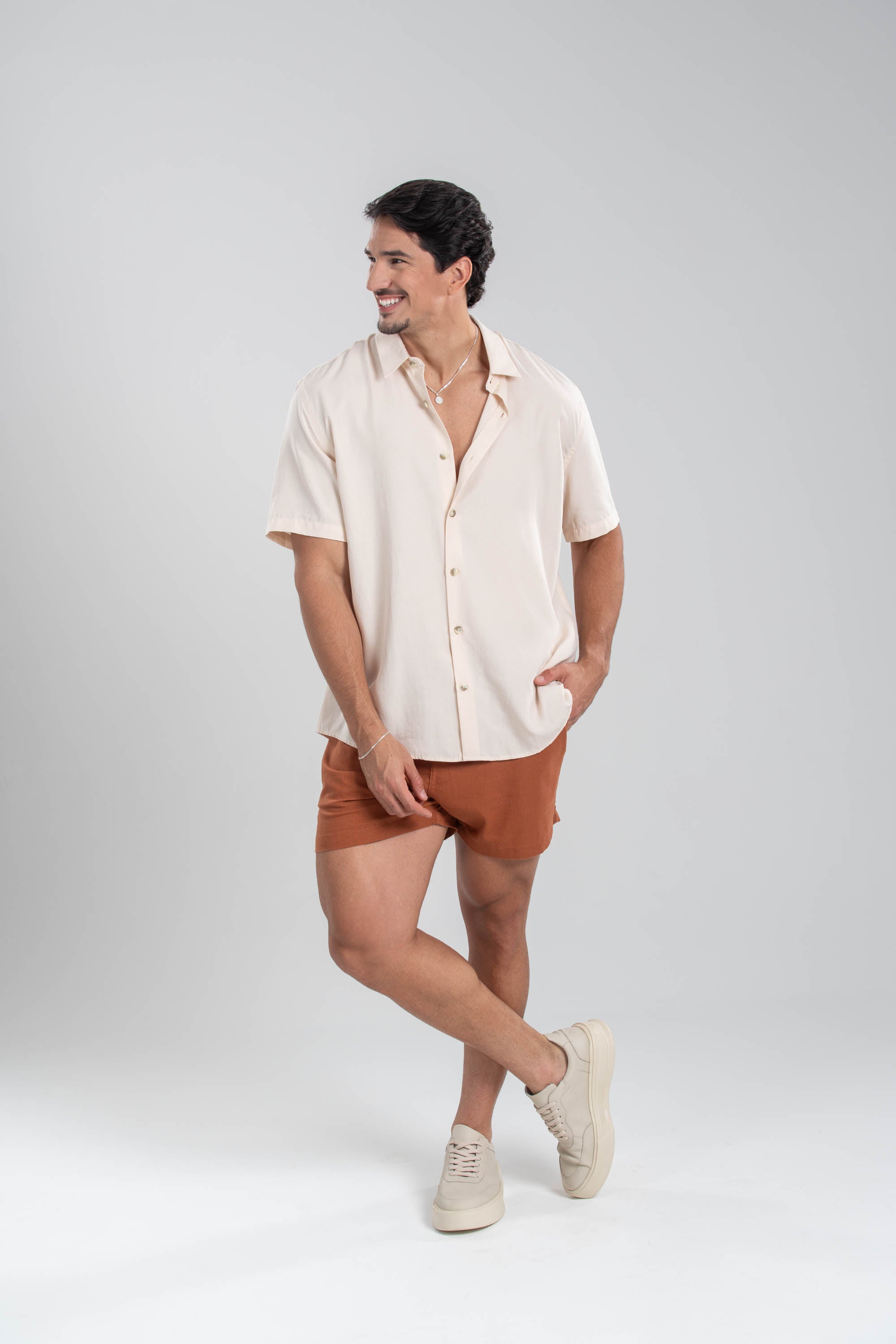 Conjunto Camisa Vegas Liocel Off Rose e Short Cut Marrom